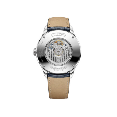 Baume & Mercier men’s watch, Clifton collection, steel case, blue alligator strap, triple folding and adjustable clasp.