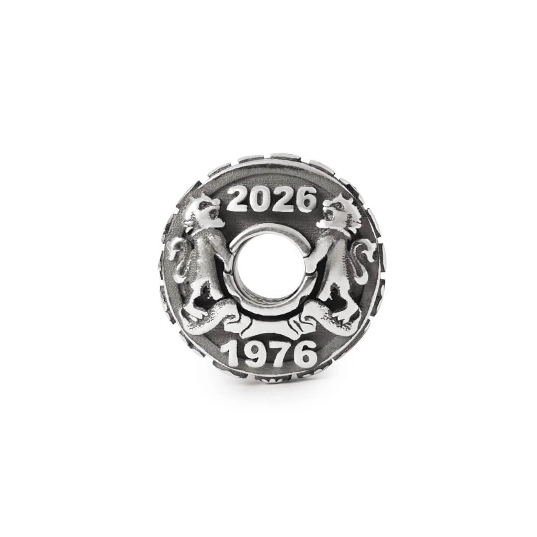 Trollbeads silver pendant, Jubilee Coin. The years 1976 and 2026 are engraved on the bead to commemorate five decades of creativity, community, and craftsmanship.