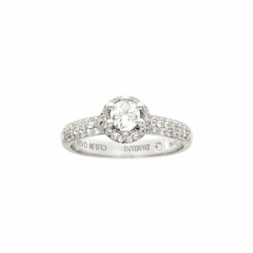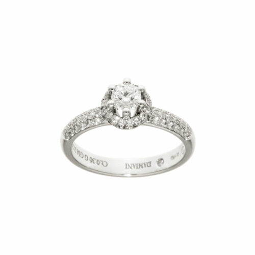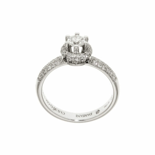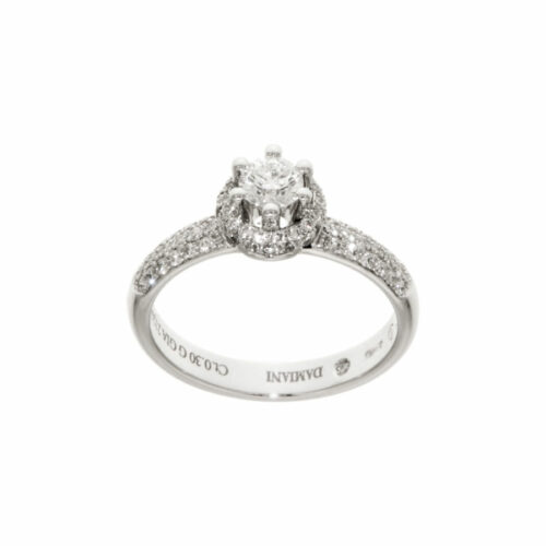 DAMIANI jewelry collection Minou Full Pavè, Engagement ring in White Gold 18 kt., with a Diamond cut round Brilliant and pavé across the top surface of the Ring, is one of the most important collections of DAMIANI jewelry, made in Italy.