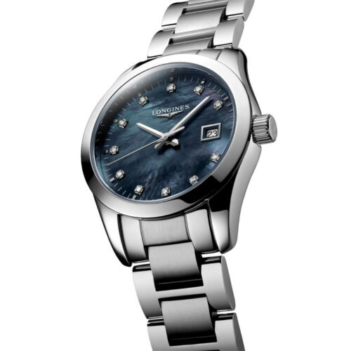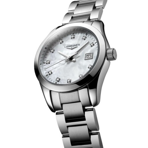 Steel case and strap, diameter 29.5mm. Quartz movement. Nacre dial with diamonds. Longines Conquest Classic, with its sophisticated design and impeccable performance is a timeless symbol of style and prestige.