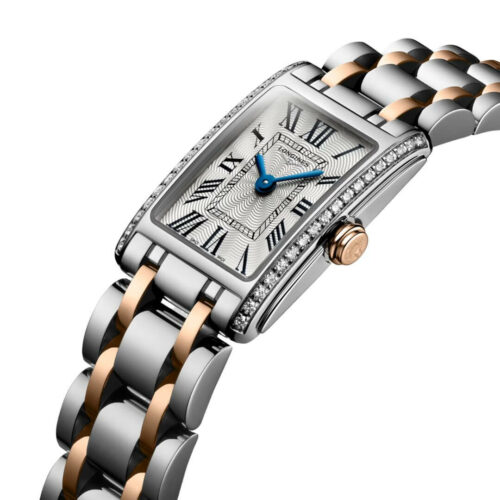 Longines women’s Dolcevita L5258 watch, rectangular diamond case and Steel and Rose Gold strap. Longines Dolcevita is a sublime combination of elegance and luxury, enhanced by the stunning beauty of diamonds.