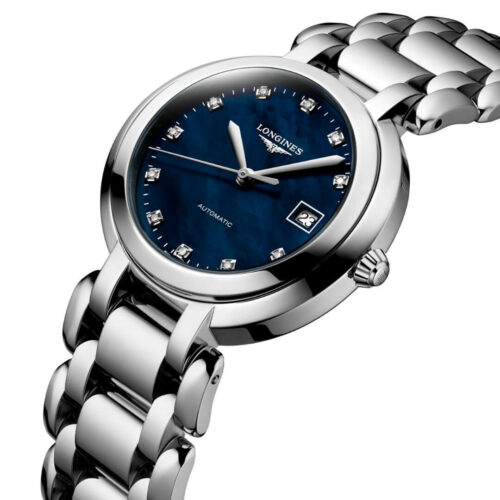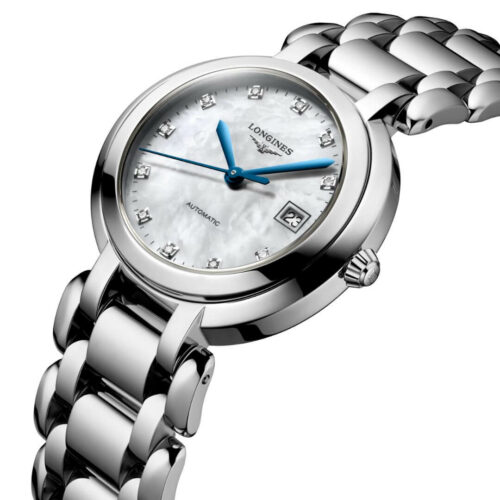 Steel case and strap, 30mm diameter. Automatic movement. Mother-of-pearl dial with diamonds. The Longines PrimaLuna L8113 embodies sophisticated elegance and timeless femininity with unparalleled sophistication.