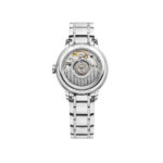 The dial stands out with its white mother-of-pearl finish, adorned with diamonds, Roman numerals, and refined indexes that catch the light with subtlety and class. The scratch-resistant sapphire crystal and transparent case back protect the heart of the watch while offering a glimpse of the movement within.