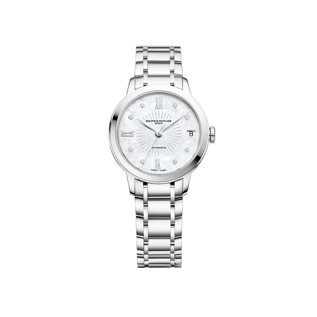 Baume & Mercier Women’s Classima Watch. Stainless steel case and bracelet, 31mm. Mother-of-pearl dial with diamonds.