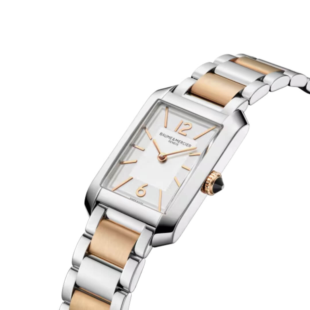 Baume & Mercier Women’s Watch from the Hampton Collection. Rectangular 35×22 mm case, stainless steel and rose gold bracelet. Quartz movement.