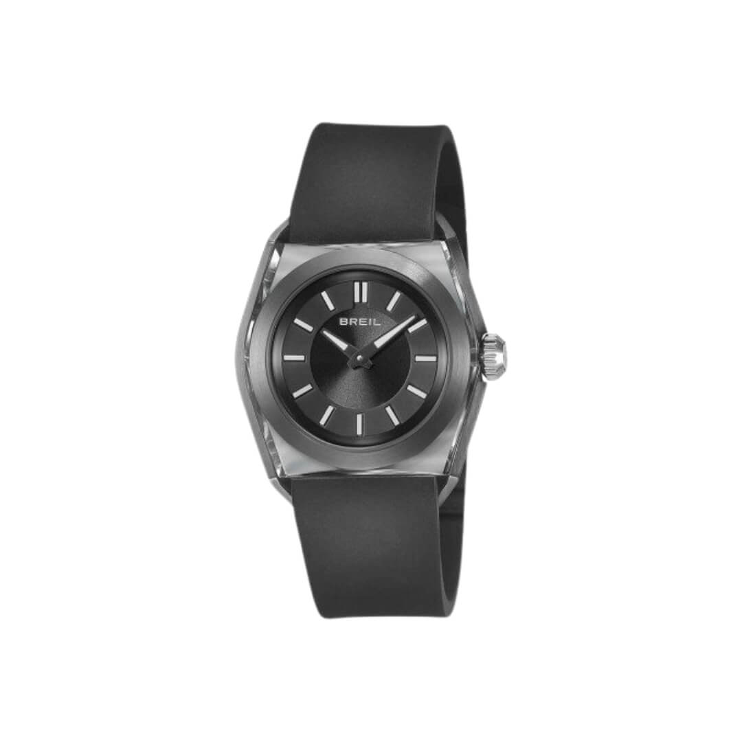 Men’s Breil watch from the Essence collection. Stainless steel case and silicone strap, 40mm. Quartz movement and black dial with blue accents.