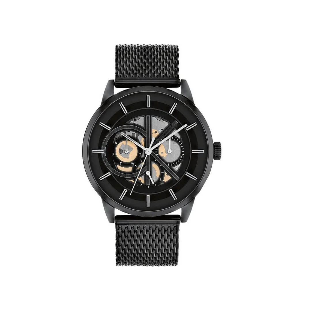 Men’s Calvin Klein watch from the Architectural collection. Black PVD-treated stainless steel case and bracelet, 43mm. Skeleton/open heart quartz movement. Milanese mesh bracelet.