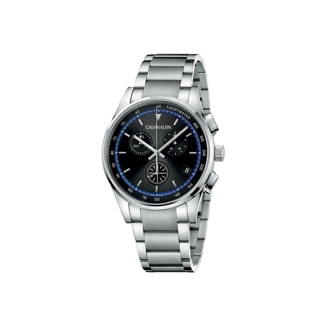 Men’s Calvin Klein watch from the Completion collection. Stainless steel case and bracelet, 43mm. Quartz movement and black dial with chronograph.