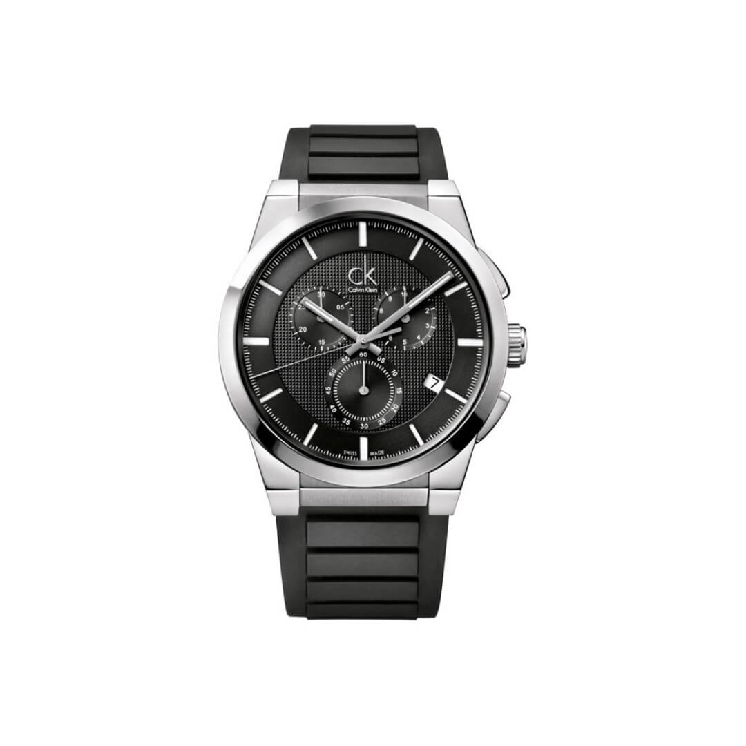Calvin Klein watch from the Dart collection. 45mm stainless steel case and black rubber strap. Quartz movement and black dial with chronograph.