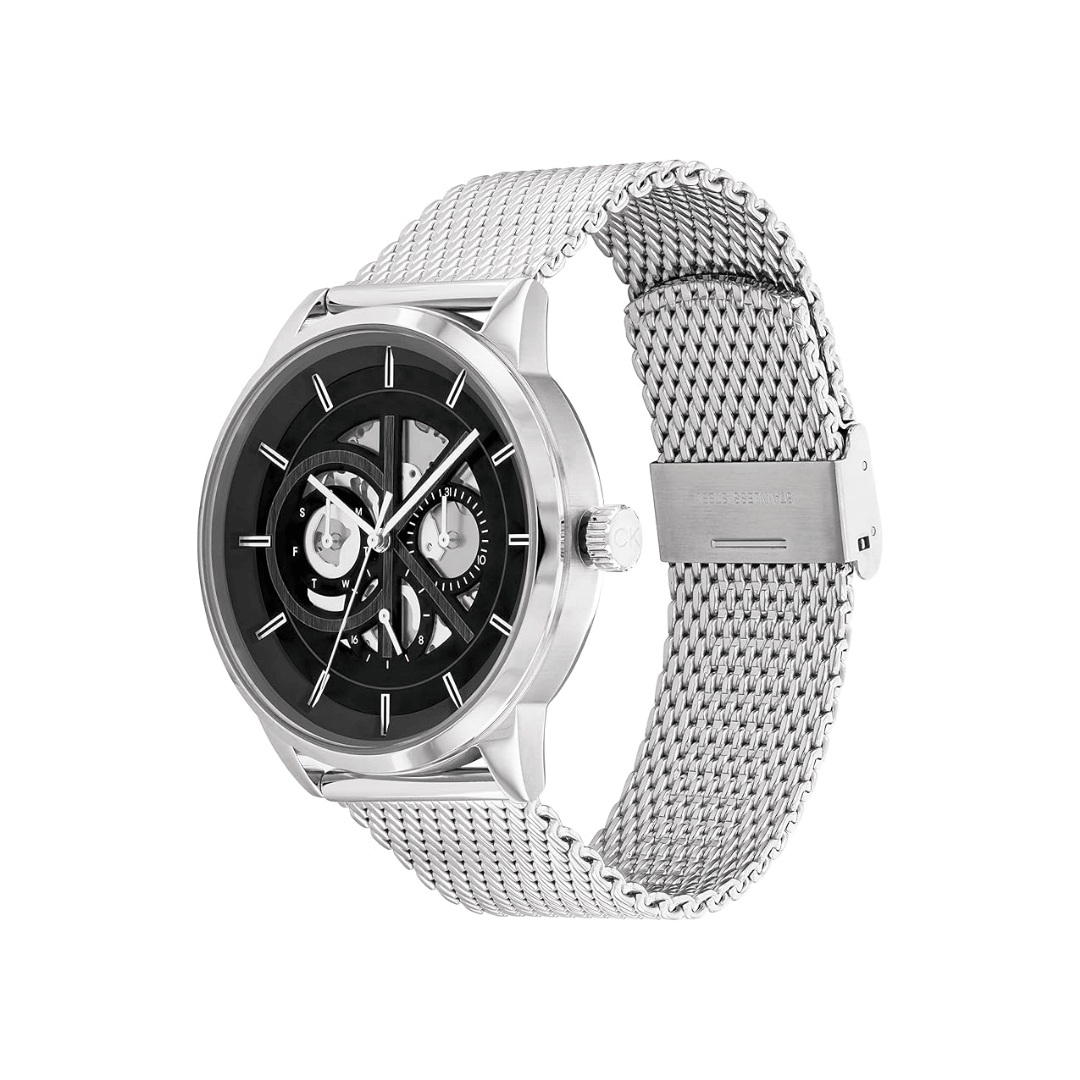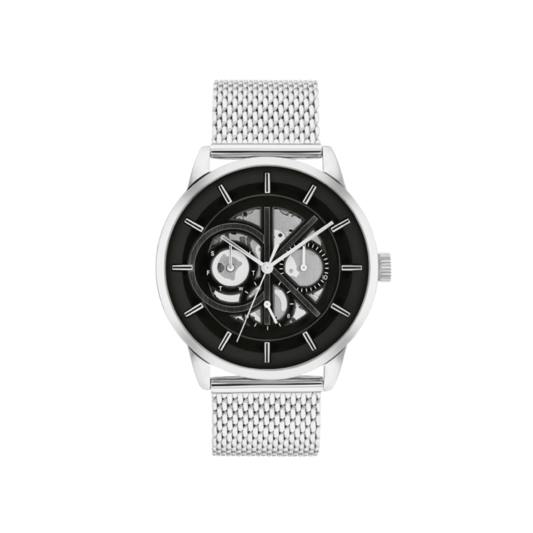 Men’s Calvin Klein watch from the Marquee collection. Stainless steel case and bracelet, 43mm diameter. Quartz movement and black dial with skeleton/open heart movement.