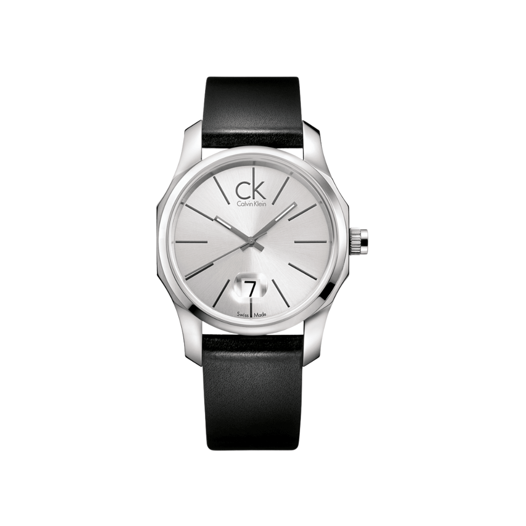Men’s Calvin Klein watch from the Biz collection. 42mm stainless steel case and black leather strap. Quartz movement and silver dial.