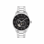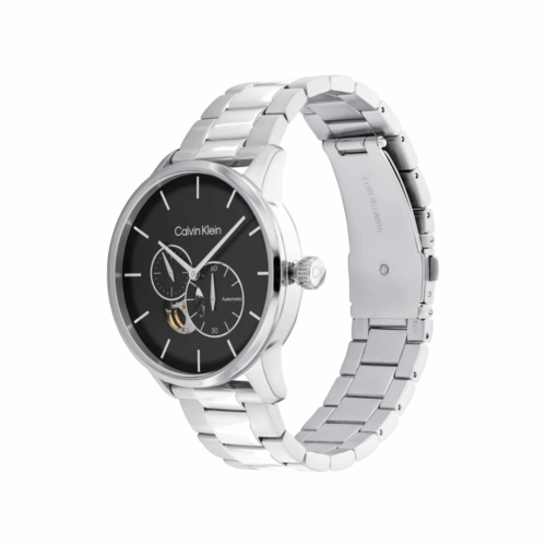 Men’s Calvin Klein watch from the Timeless collection. Stainless steel case and bracelet, 41mm diameter. Automatic movement and black dial.