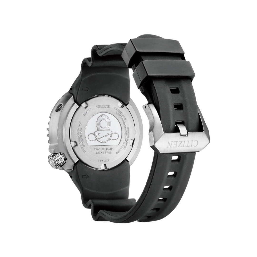 Men’s Citizen watch from the Diver’s collection. Stainless steel 46mm case, silicone strap. Eco‑Drive movement, water‑resistant to 300m.