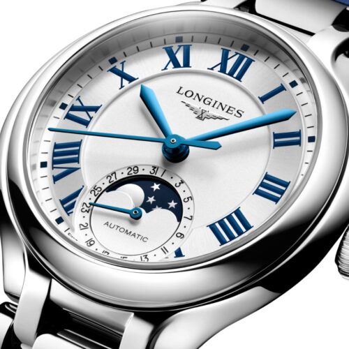 Longines PrimaLuna Moonphase Women’s Watch. Automatic movement. 34mm steel case and blue leather strap.