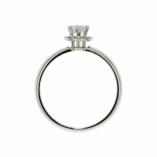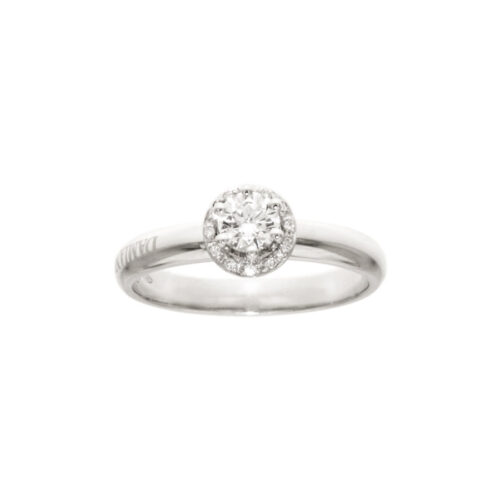 Il design del castone nell’ Anello Solitario Minou Pavè in Oro Bianco 750/000 (18Kt.), è una esclusiva di DAMIANI gioielli.