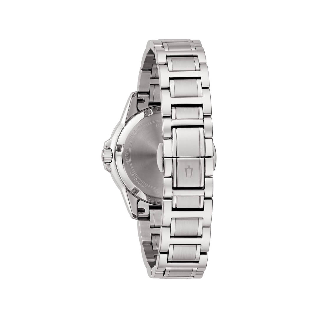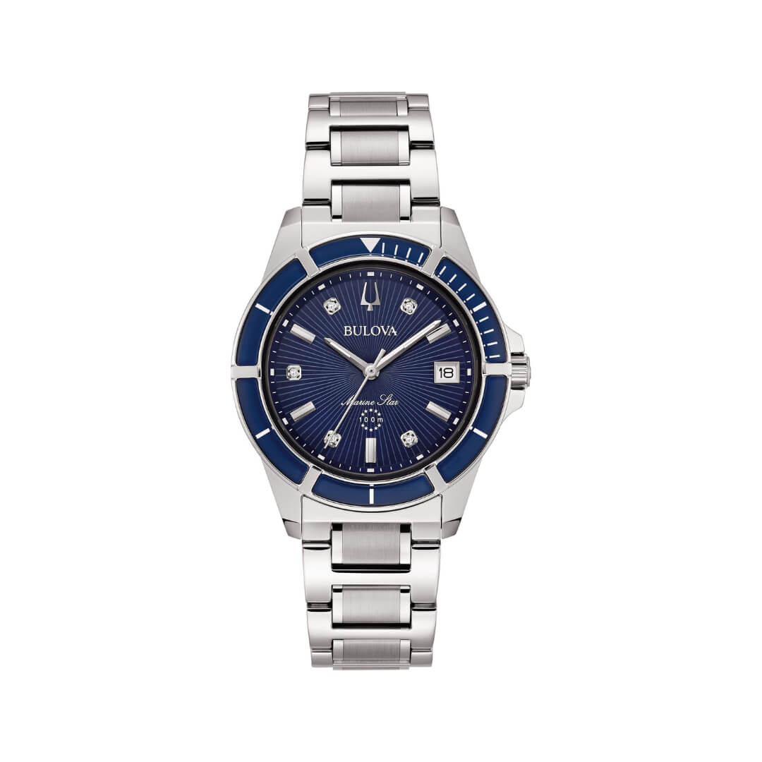Orologio da donna Bulova della collezione Marine Star Lady. Cassa e cinturino in acciaio, 34mm. Movimento al quarzo, quadrante con diamanti.