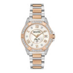 - Modello 98R234: cassa e cinturino in acciaio bicolore, movimento al quarzo, quadrante madreperla con diamanti.