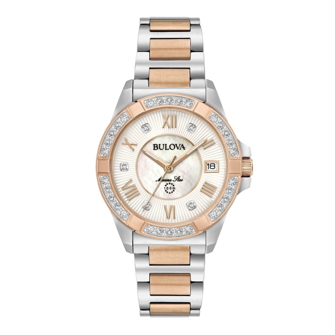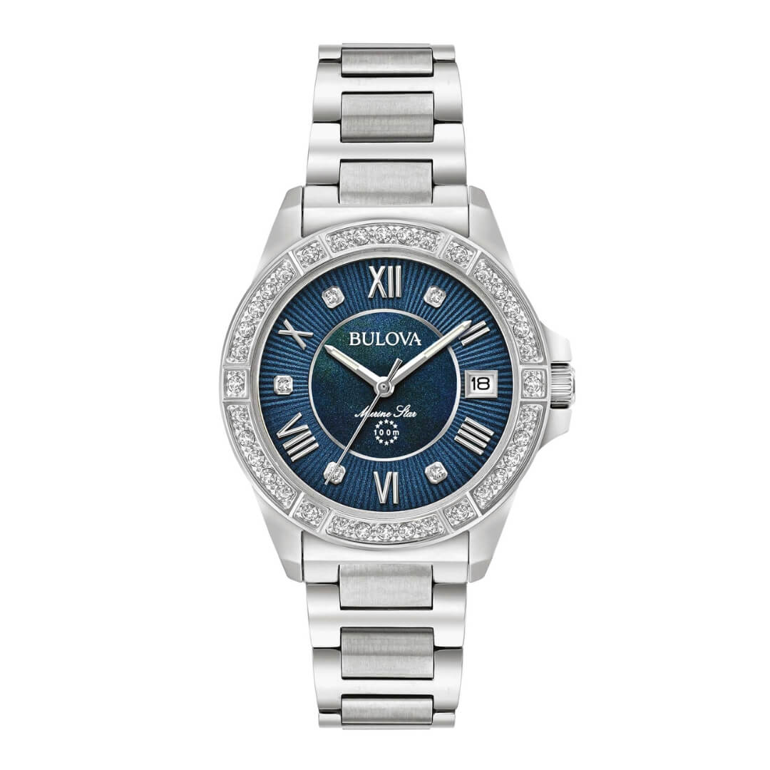 Orologio da donna Bulova della collezione Marine Star Lady Diamonds. Cassa e cinturino in acciaio, 32mm. Movimento al quarzo.