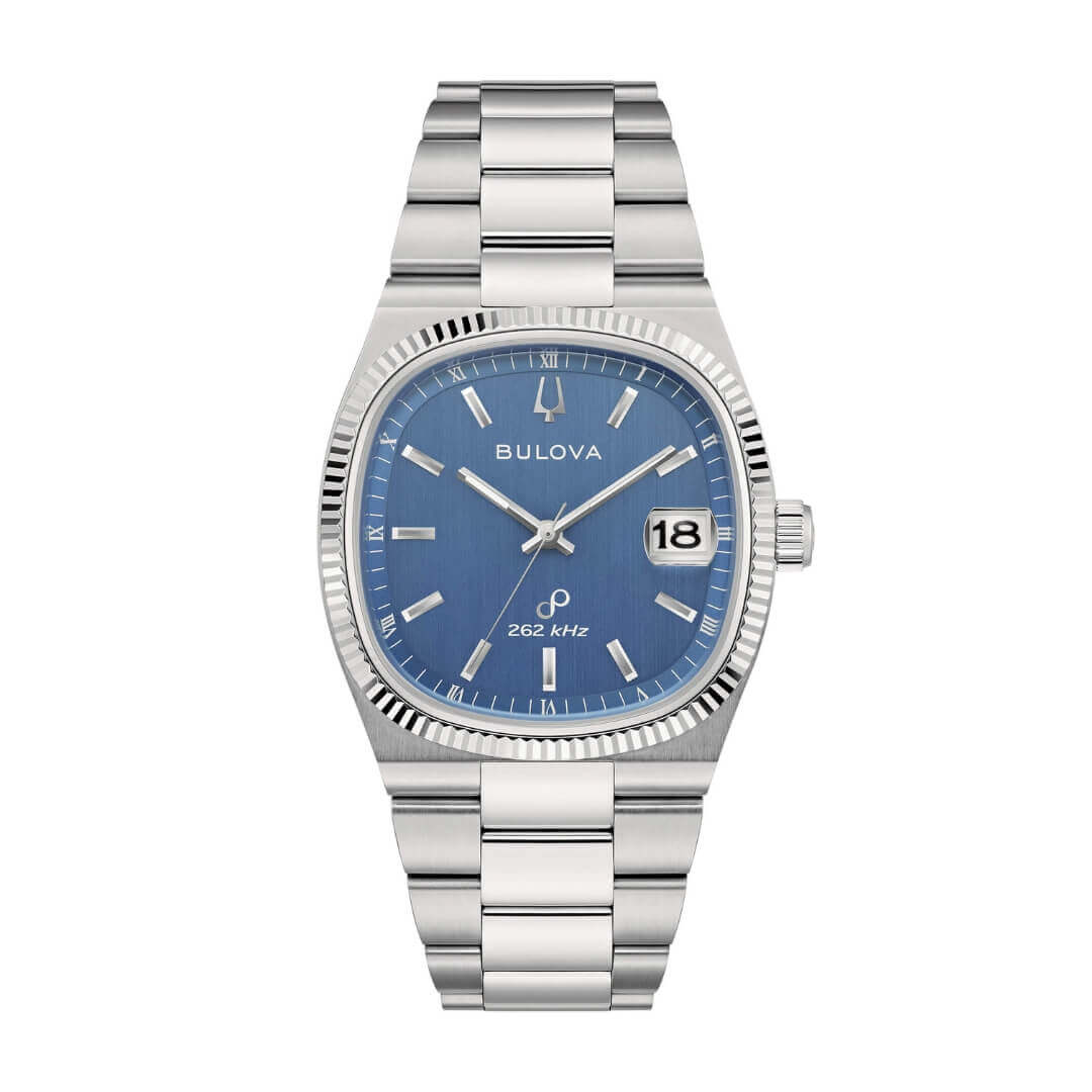 Il Bulova Super Seville è un orologio da uomo che unisce l’estetica retrò degli anni ’70 con l’innovazione tecnologica contemporanea. La cassa in acciaio inossidabile da 38 mm presenta una distintiva forma “TV”, completata da una lunetta zigrinata che aggiunge un tocco di eleganza vintage. Il quadrante argentato con finitura spazzolata verticale ospita indici applicati e lancette lucide, offrendo una leggibilità chiara e raffinata. La finestra della data a ore 3 è arricchita da una lente d’ingrandimento integrata nel vetro zaffiro piatto, garantendo una lettura immediata.