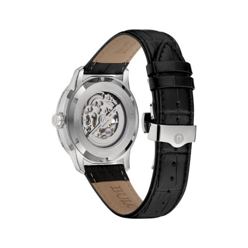 Orologio da uomo Bulova della collezione Sutton Skeleton. Cassa in acciaio da 43mm, cinturino in pelle nera. Movimento automatico a vista.