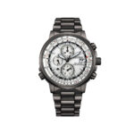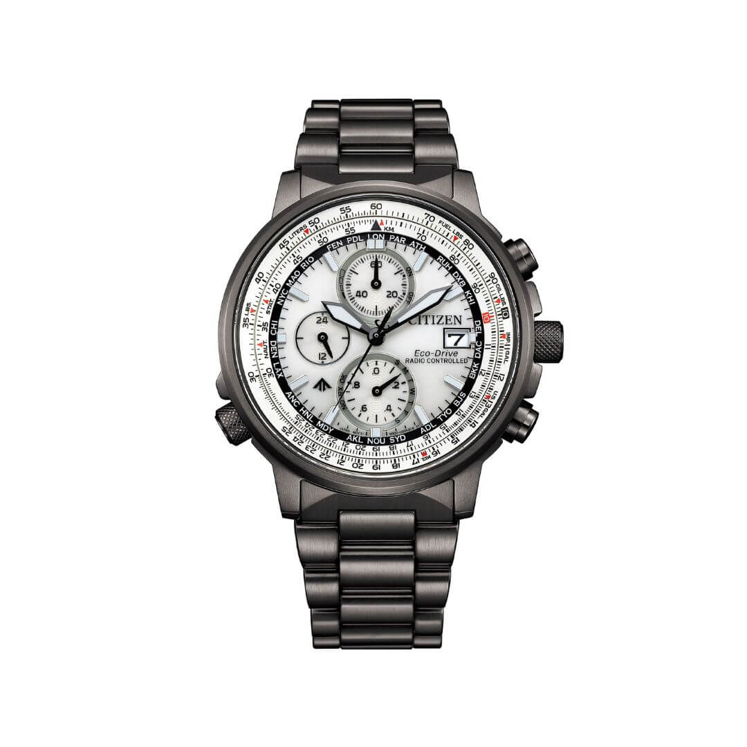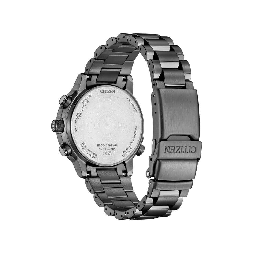 Orologio da uomo Citizen della collezione Crono Pilot. Cassa e cinturino in acciaio nero, 41nn diemetro. Radiocontrollato, movimento ecodrive.