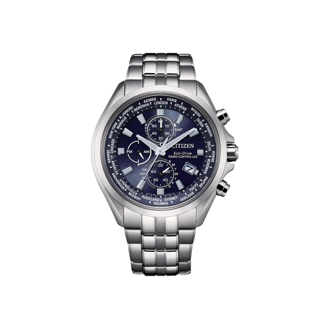 Orologio da uomo Citizen Radiocontrollato. Cassa e cinturino in acciaio, diametro 44mm. Movimento eco drive, quadrante con cronografo blu.
