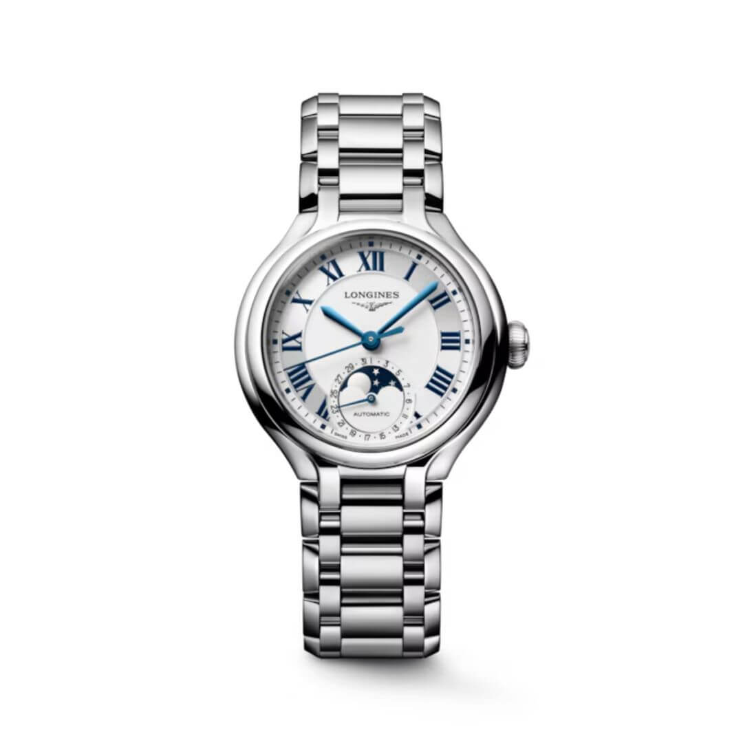 Orologio da donna Longines della collezione Primaluna Moonphase. Movimento automatico. Cassa e cinturino in acciaio, diametro 34mm.