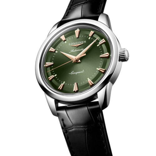 - Modello L16504022: cassa in acciaio, quadrante verde, 40mm, cinturino in pelle nera, movimento automatico, indici e lancette color oro rosa.