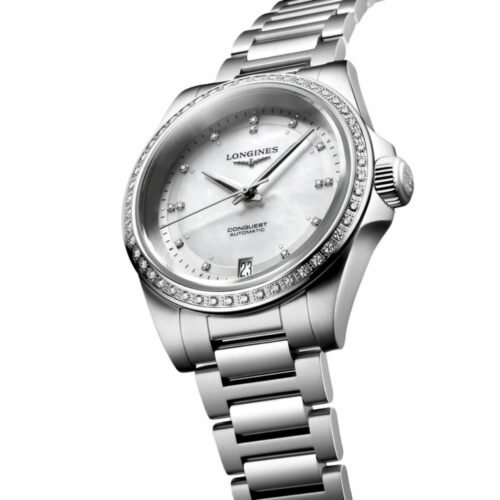 Orologio donna Longines collezione Conquest L3430. Cassa e cinturino in acciaio, diametro 34mm. Movimento automatico. Quadrante madreperla con diamanti.