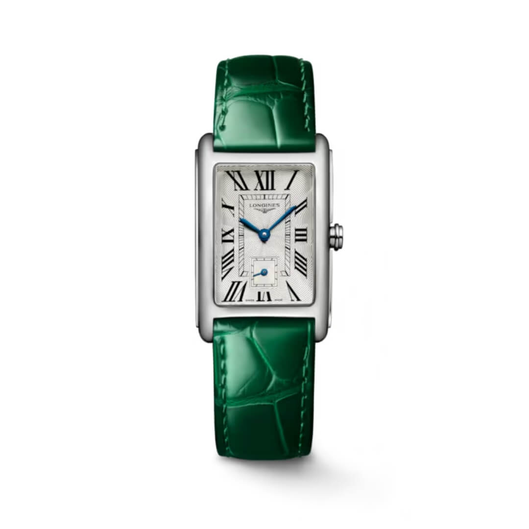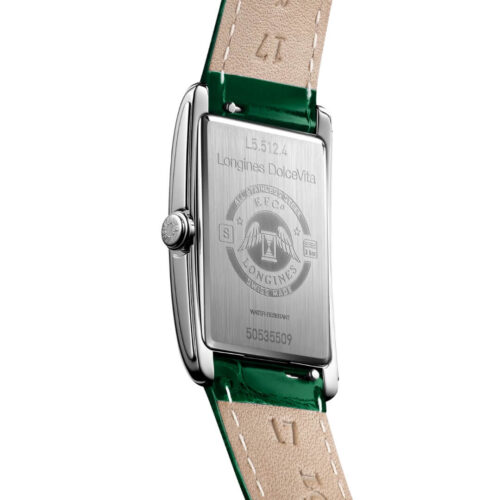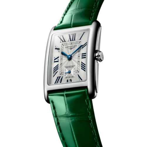 Orologio da donna Longines della collezione Dolcevita. Cassa in acciaio rettangolare, 23×37 e cinturino in pelle verde. Movimento al quarzo.