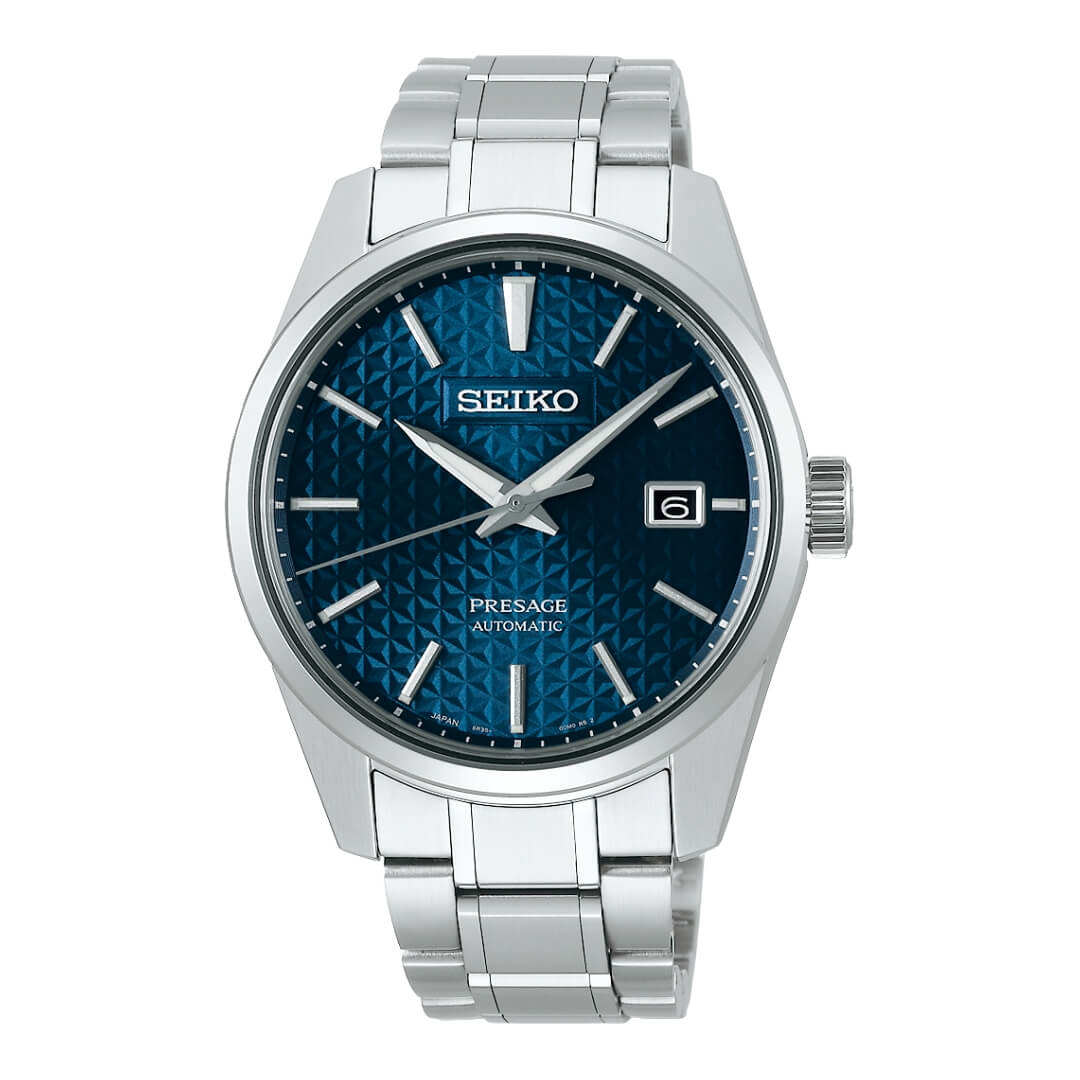 Orologio da uomo Seiko della collezione Presage Sharp Edged. Cassa e cinturino in acciaio, 39mm. Movimento automatico, quadrante blu.