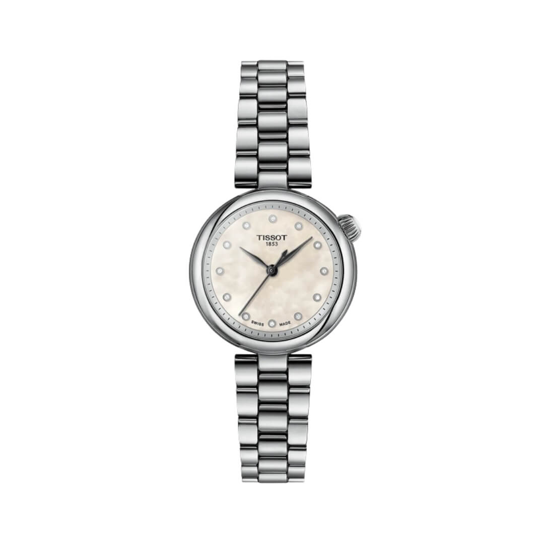 Orologio da donna Tissot della collezione Desir. Cassa e cinturino in acciaio, diametro 28mm. Movimento al quarzo, quadrante in madreperla con diamanti.