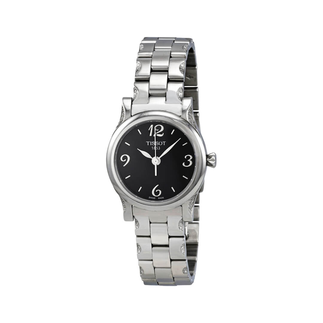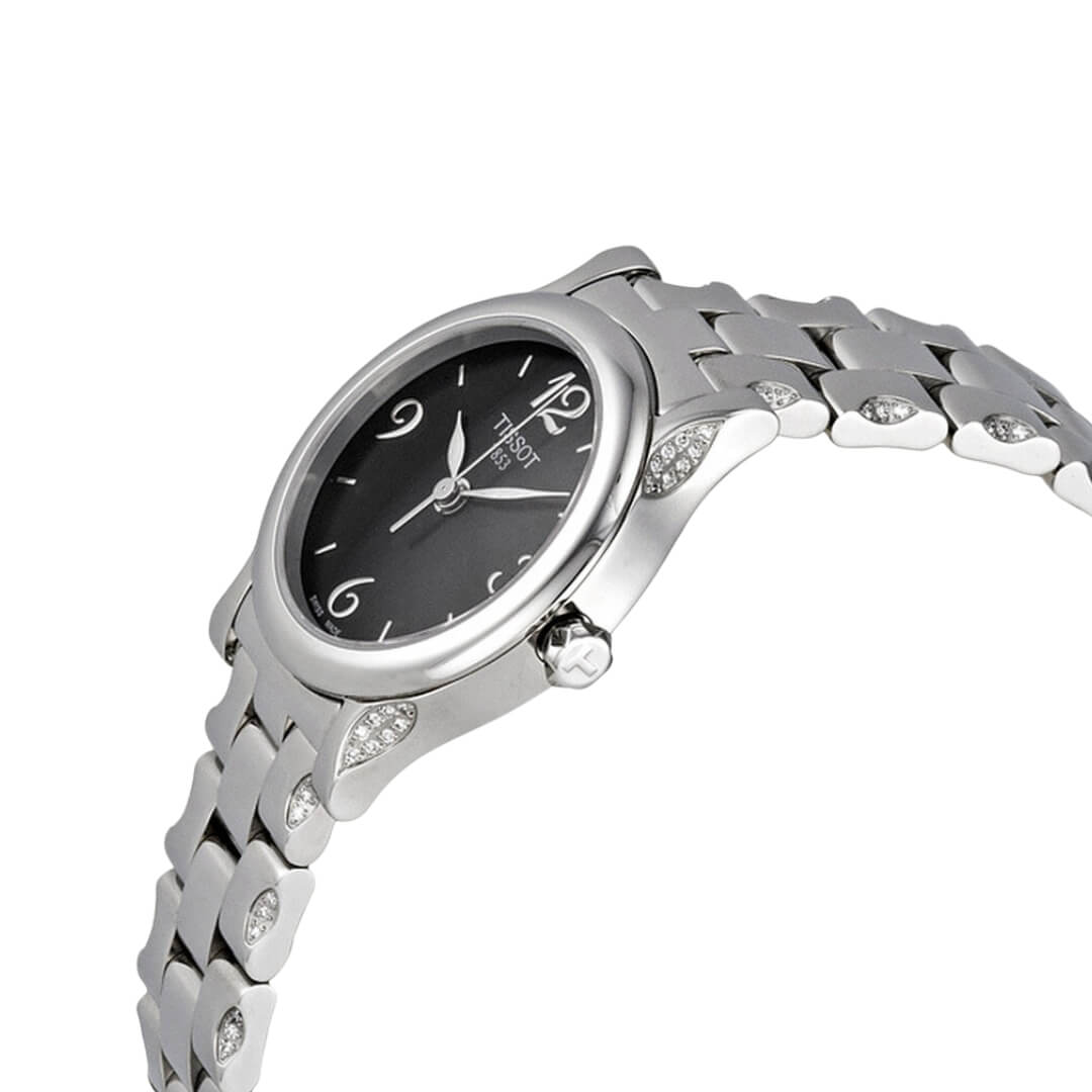 Orologio da donna Tissot della collezione Stylist-T. Cassa e cinturino in acciaio, diametro 28mm. Movimento al quarzo, quadrante nero.