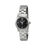 La cassa rotonda in acciaio inossidabile da 28 mm (spessore 8 mm) è perfettamente dimensionata per un polso femminile, offrendo una vestibilità comoda quanto scintillante, grazie al bracciale in acciaio lucidato con chiusura a scomparsa. Il cuore visivo è il quadrante nero profondo, protetto da un resistente vetro zaffiro antigraffio.
