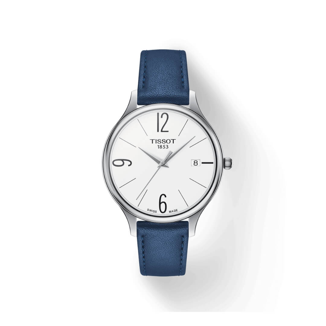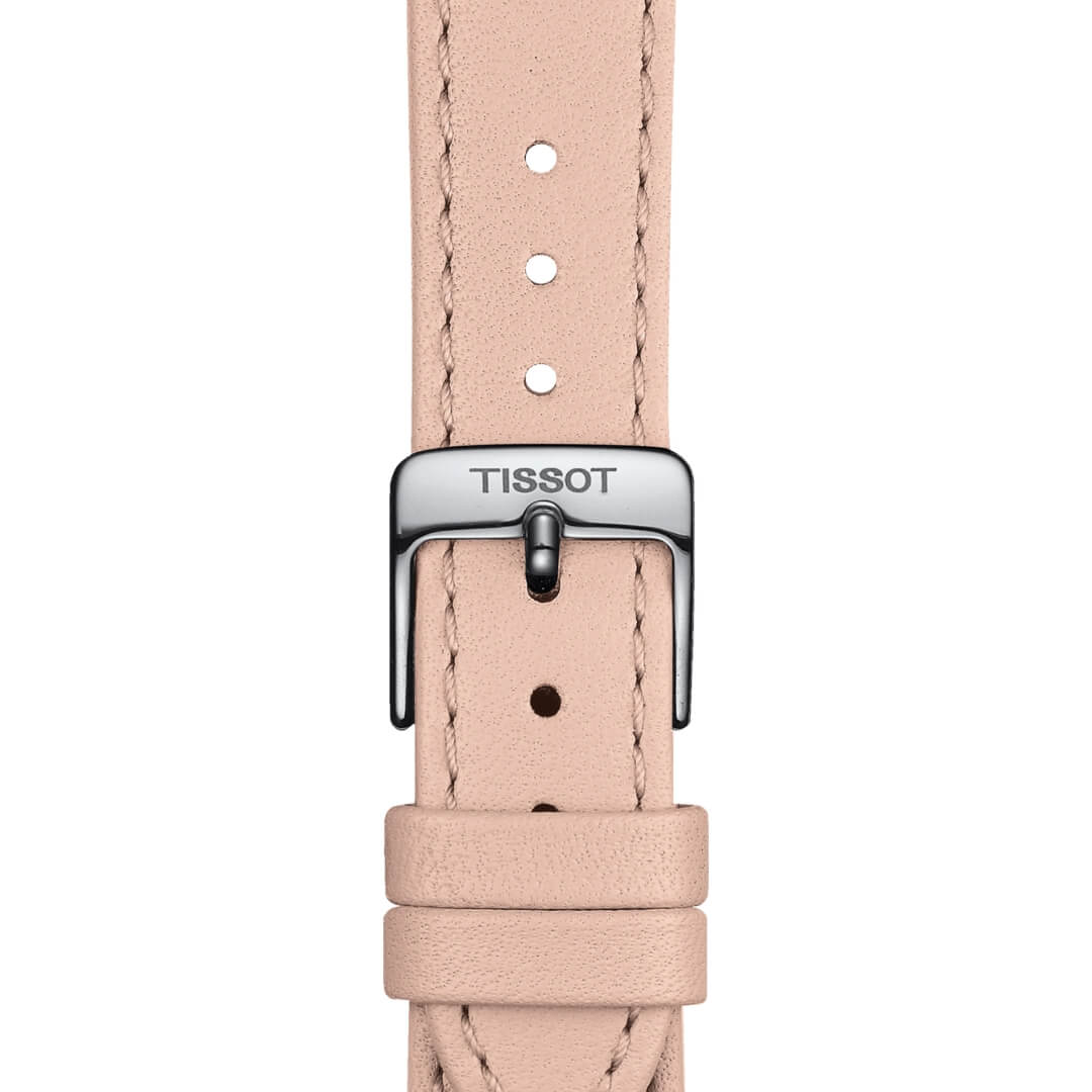 Orologio Tissot da donna della collezione T-Lady Bella Ora. Cassa in acciaio e doppio cinturino in pelle, 38mm. Quadrante bianco.