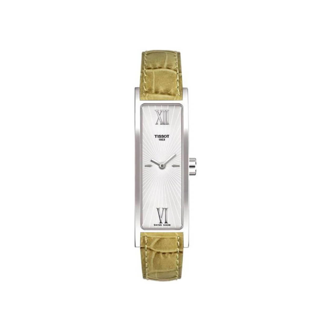 Orologio da donna Tissot della collezione Happy Chic. Cassa rettangolare in acciaio, 14x40mm. Cinturino in pelle beige, quadrante silver.