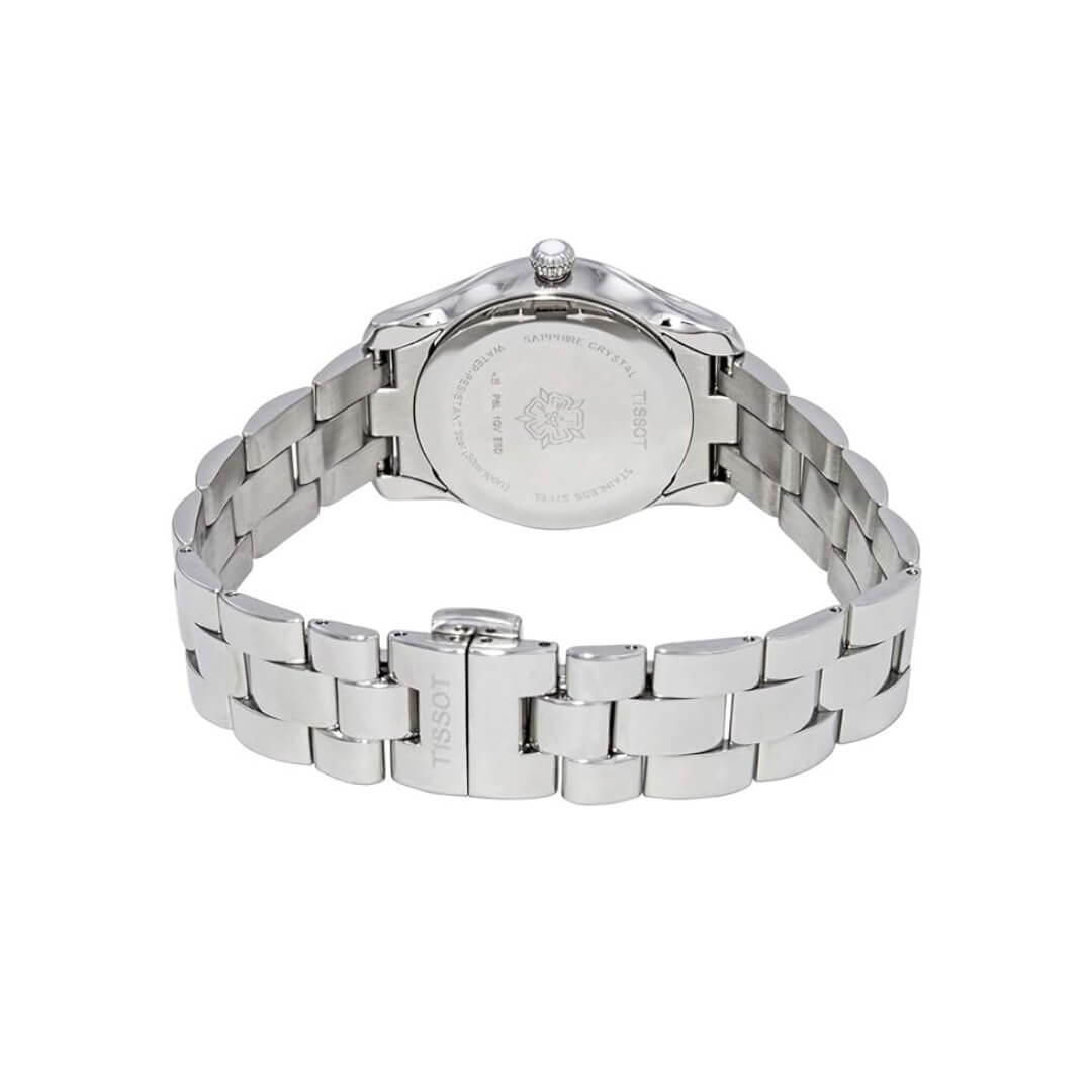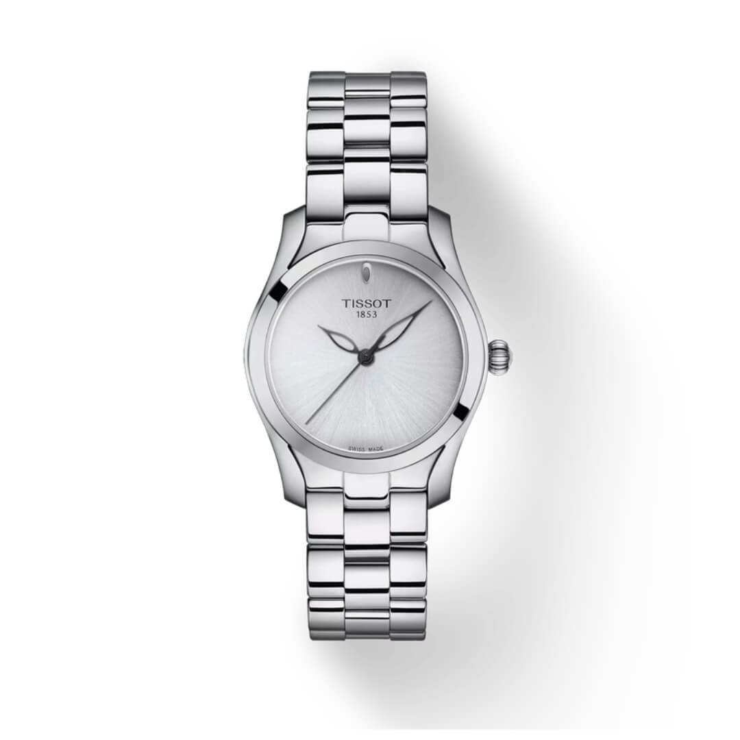 Orologio da donna Tissot della collezione T-Wave. Cassa e cinturino in acciaio, 30mm diametro. Movimento al quarzo e quadrante silver.