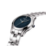 Il vero fascino è racchiuso nel quadrante nero con effetto “brillantini”, detto anche sunray scuro, dove un design minimalista si arricchisce di dettagli lussuosi. L’indice a goccia posizionato a ore 12, spesso realizzato in madreperla nera per la versione scura o rifinito con diamanti come in altre varianti della serie, funge da prezioso punto focale. Le lancette scheletrate ricordano i petali di un fiore, completando l’estetica sofisticata.