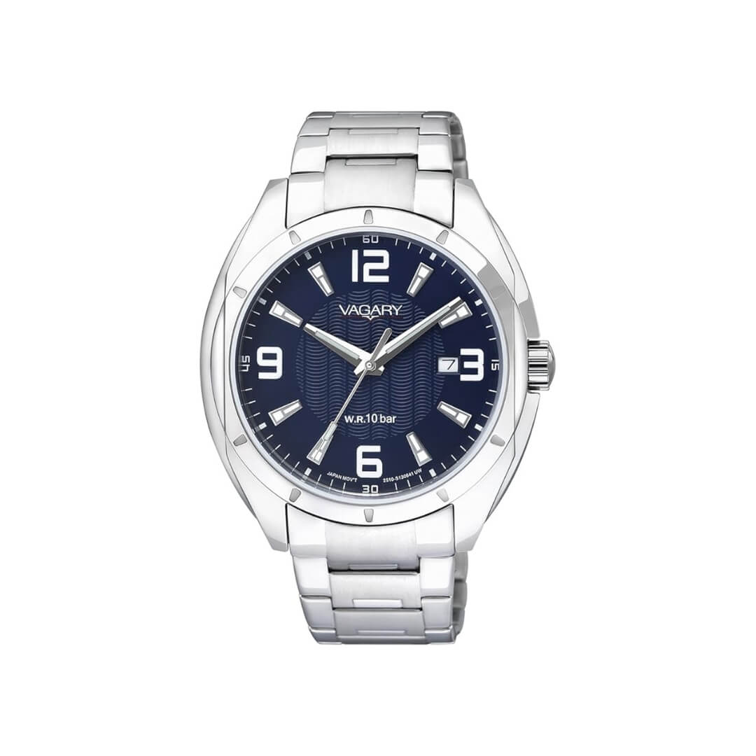 Orologio da uomoVagary by Citizen, collezione Rockwell. Cassa e cinturino in acciaio, 42mm. Movimento al quarzo e quadrante blu. Resistente all’acqua fino a 100 metri.